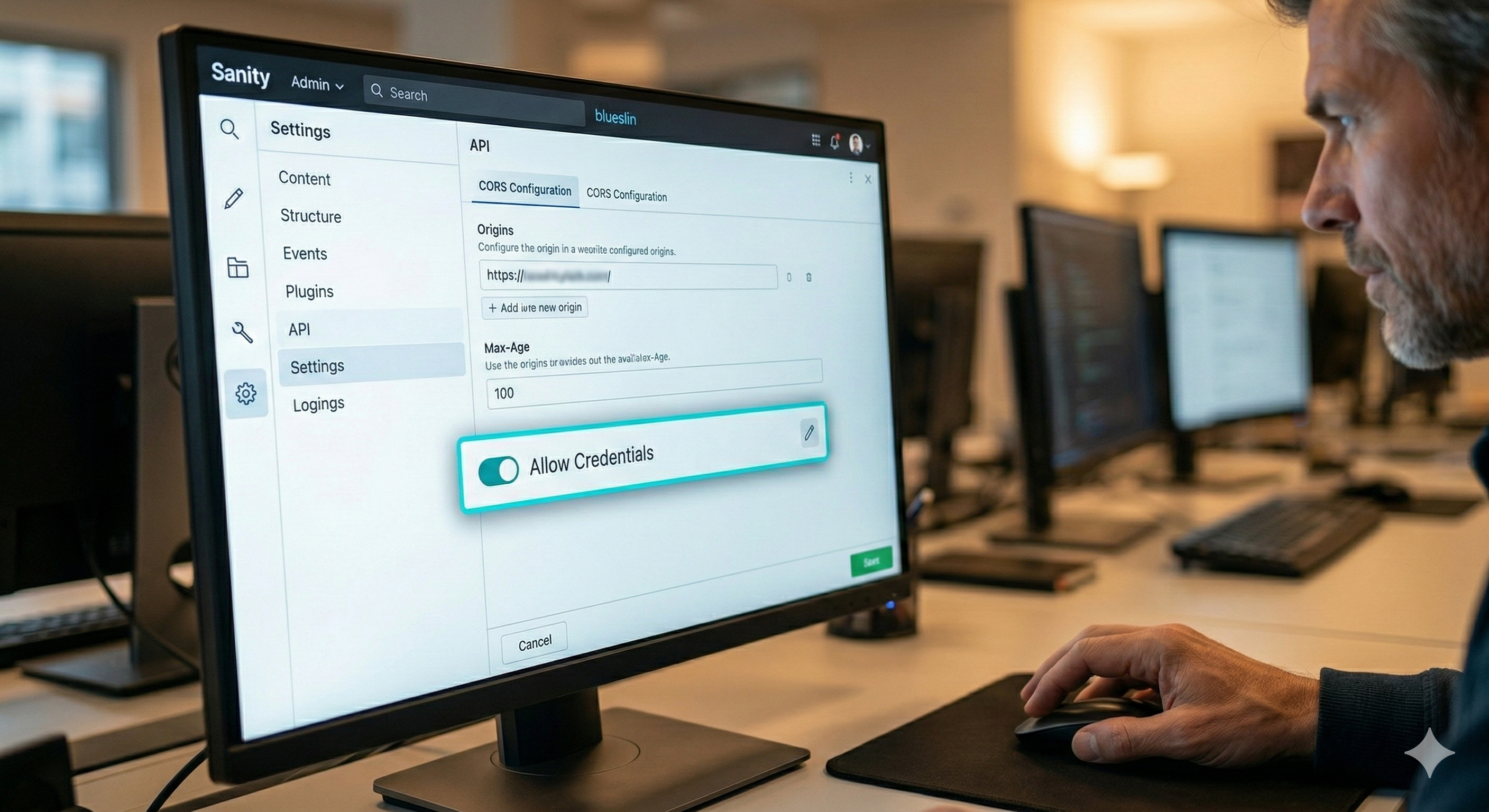 Sanity 走的是 Token 认证,不走 Cookie,Credentials 开关不需要打开。打开了反而会触发浏览器更严格的跨域策略,到时候反而崩掉。