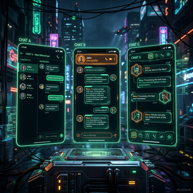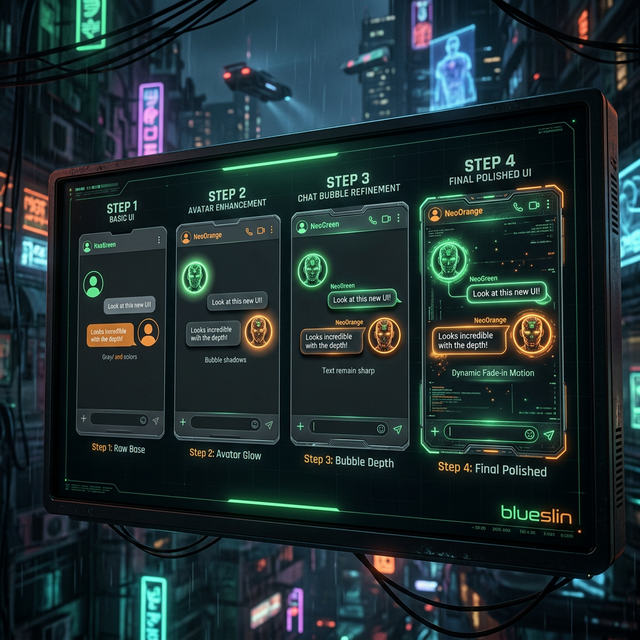 打开浏览器,输入 blueslin.com,进入 Vlog 9 文章页面。手机屏幕上,对话气泡一个个从两侧淡入,头像有微弱的发光效果,绿光和橙光在昏暗的车厢里显得很柔和。他上下滑动,阅读体验确实好多了——内容密度高,不用频繁往下划,头像和发光效果增加了科技感,但又不喧宾夺主。
