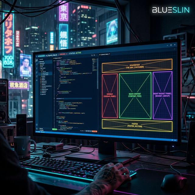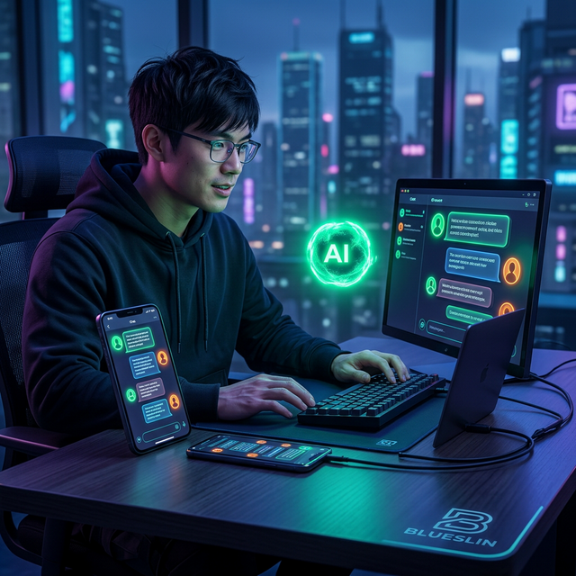 打开家里的台式机,显示器亮起来。他打开 blueslin.com,用大屏幕再看一遍对话气泡的效果。桌面端的效果也很好,头像发光,阴影立体,淡入动画流畅。他打开开发者工具,切换到移动端模拟器,确认响应式布局正常。