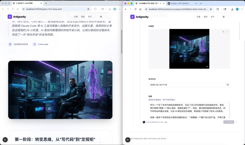 作为一个写了多年代码的后端程序员,见证了这几年互联网行业的起起伏伏。曾经,我们相信“掌握一门核心语言,就能吃遍天下”;现在,面对越来越卷的职场生态、时不时传出的裁员消息,以及 AI 疯狂进化的速度,焦虑感几乎是每个技术人的底色。 但我一直有个非常世俗又极其浪漫的执念:**我要做一个属于自己的产品,不再只是大厂里的一颗螺丝钉,而是打造一家“一人公司”(OPC - One Person Company)。** 这个博客,就是我的试验田。在这里,我不只要沉淀技术经验,还要尝试“出海”挂载独立工具,探索流量变现的第二曲线。 过去,一个后端开发者想从零手搓一个现代化的全栈项目,成本高得令人望而却步:繁杂的前端构建、让人头大的 CSS 居中、SEO 优化、CMS 接入……哪怕能做出来,往往也因为耗时太长而中途放弃。 直到我将 Claude Code 等 AI 工具深度融入到我的开发流中。这篇文章,我想和你分享在这短短的 24 小时里,AI 是如何颠覆我的传统开发认知,让我以极低的试错成本,完成了一次“单兵作战”的全栈突围。